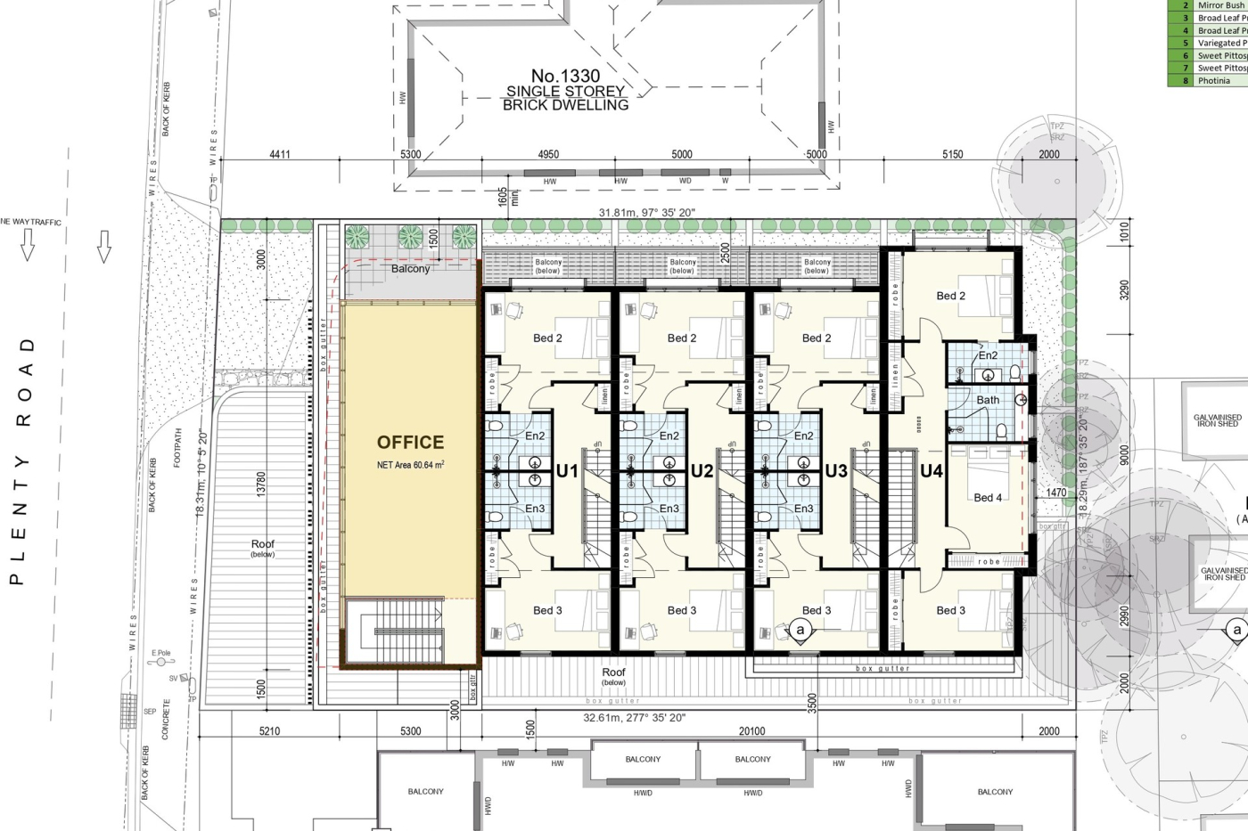 The approved permit features an intelligently designed mixed-use project comprising four contemporary townhouses and a front office space with outstanding Plenty Road frontage. Each townhouse offers four bedrooms with individual ensuites and a double garage, designed for modern, low-maintenance living. The office component includes three dedicated staff car spaces and is ideally suited for professional or commercial use.