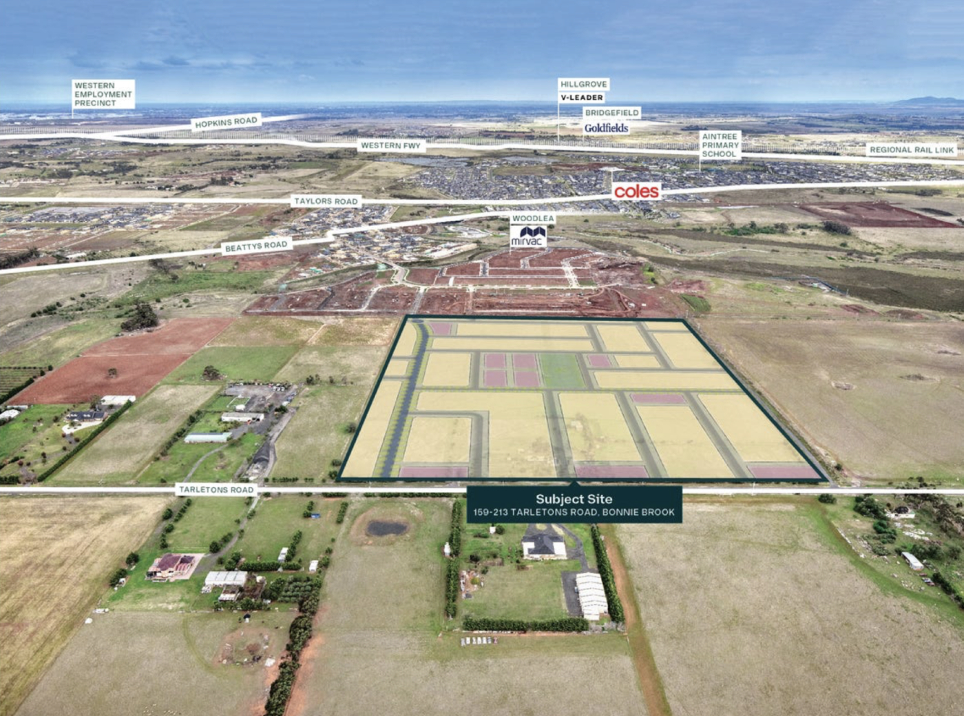 Core Land in conjunction with Biggin & Scott Land are delighted to offer 159-213 Tarletons Road, For Sale by Expression of Interest. At 19.5 hectares (48.16 acres), this incredible opportunity features expansive frontage to Tarletons Road and is expected to deliver 400+ residential lots (STPA). Directly abutting Mirvac’s Woodlea Estate, the site benefits from existing development directly on its southern boundary, with services and road connections currently under construction.