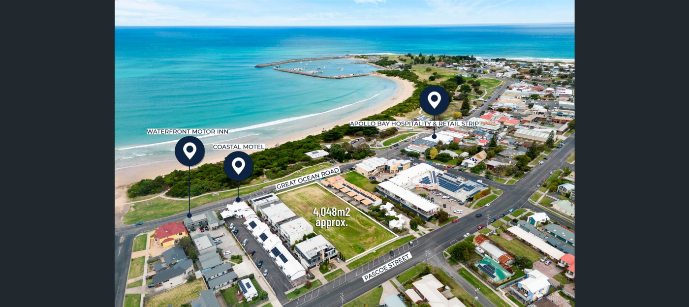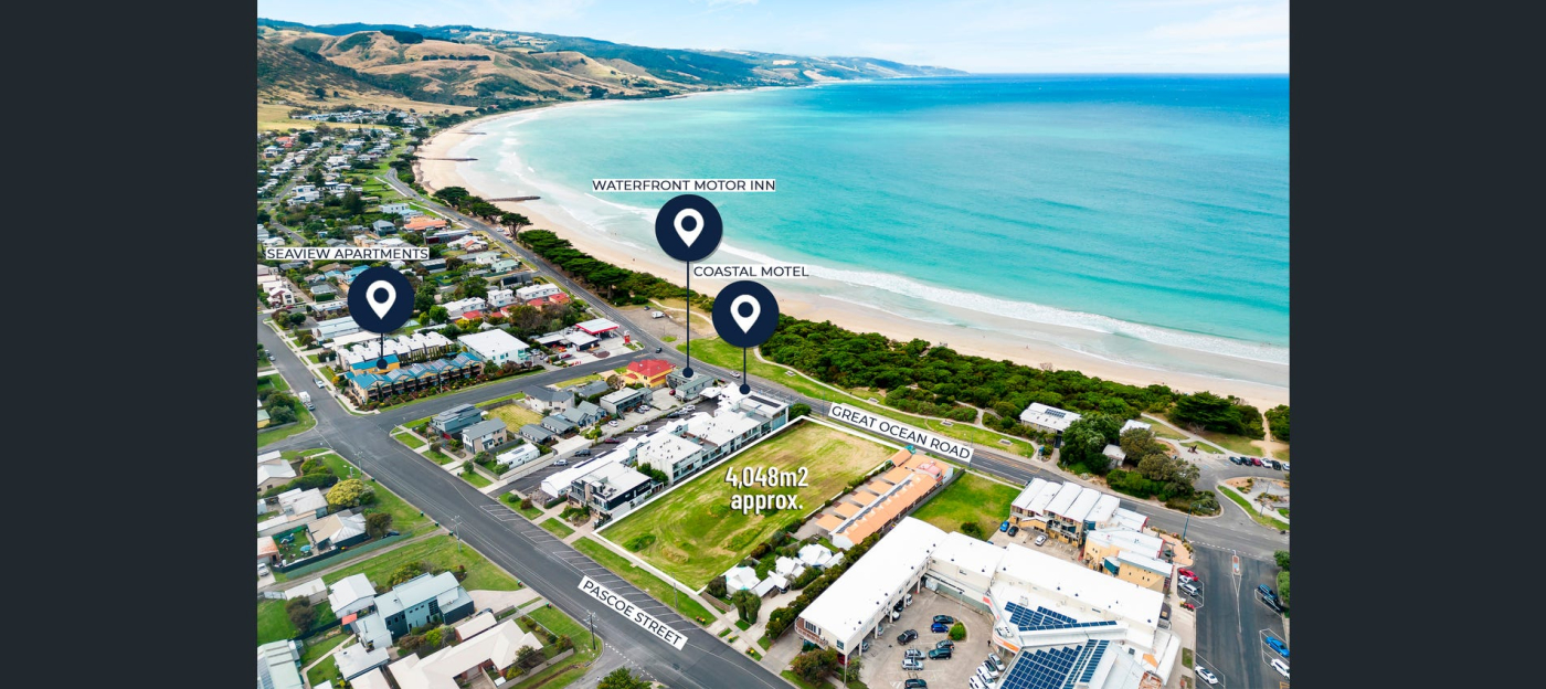 Land Area 4,048sqm approx. with two street frontages with a massive 40.24 metre frontage to the Great Ocean Road and 40.24 metres to Pascoe Street.