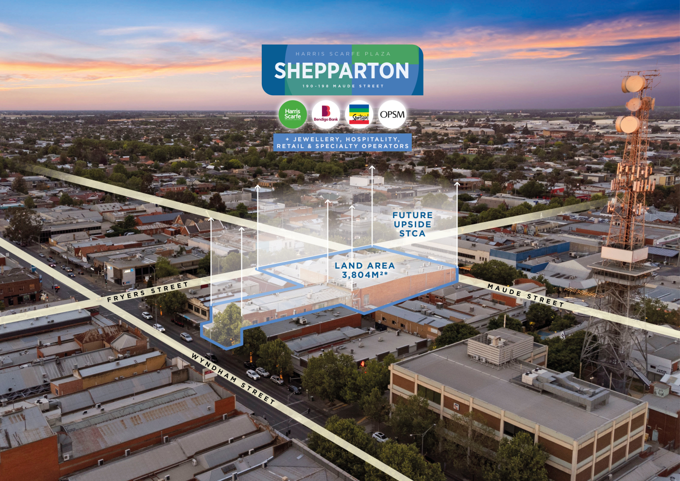 Harris Scarfe Plaza presents as one of Shepparton’s premier CBD landholdings, a substantial income producing retail centre anchored by national tenants and positioned across three (3) major street frontages.