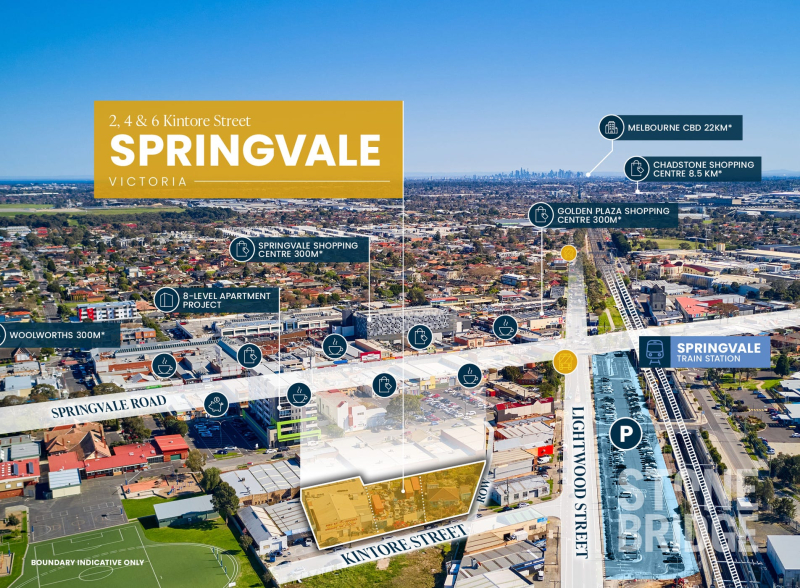 - Unrivalled 2,445 sqm* landholding located ideally within the Springvale Activity Centre providing undeniable access to Springvale’s best local amenity including the Springvale Road retail strip (150 m*) which includes numerous banks, cafés and restaurants, the Springvale Shopping Centre (300 m*) and Golden Plaza Shopping Centre (300 m*)