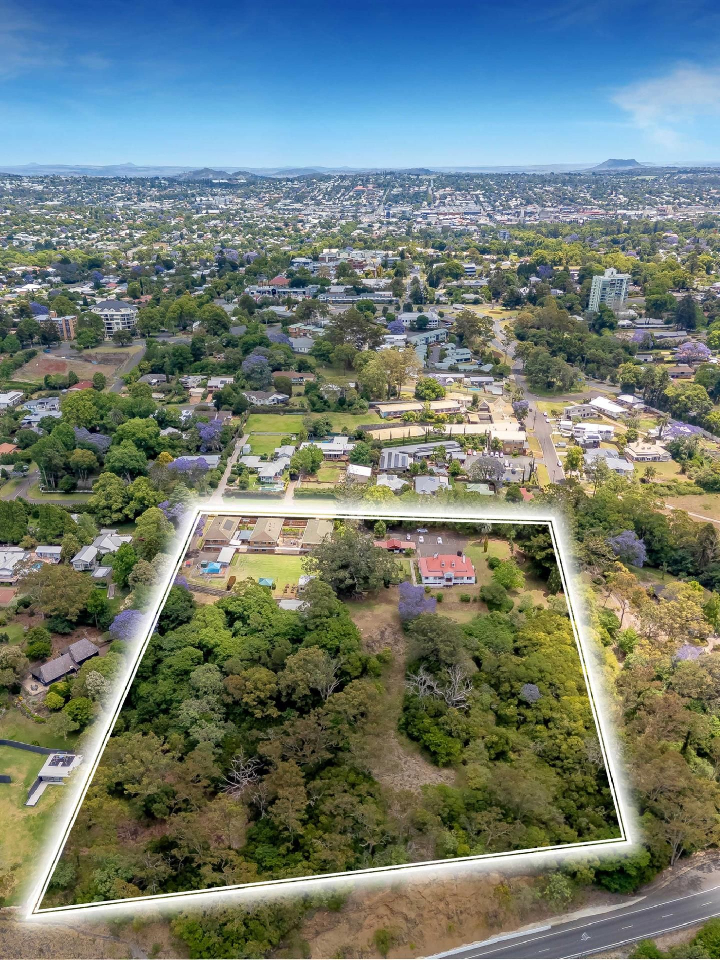 Savills are selling a once-in-a-generation asset – one of the largest privately owned landholdings atop the prestigious Toowoomba Range. Spanning two adjoining allotments totalling 27,910 square metres* (6.9 Acres*), the property is located along Curtis Street, offering a unique development opportunity in a highly sought-after location. Just 500 metres* from the Toowoomba Private Hospital and 1 kilometre* from the Toowoomba CBD, this property offers superb access to major transport corridors, key services, and local amenities, ensuring it’s an ideal location for development.