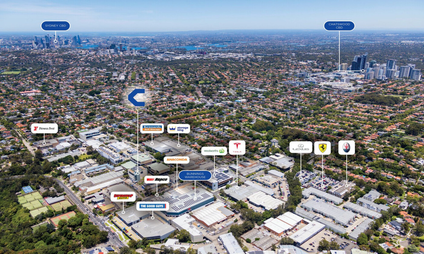 •Strategically positioned in the established and highly sought after Chatswood East industrial precinct which is home to major institutions in a diverse range of industries such as; Bunnings Warehouse, Woolworths, Tesla, Kennards Self Storage, Storage King and Anaconda.