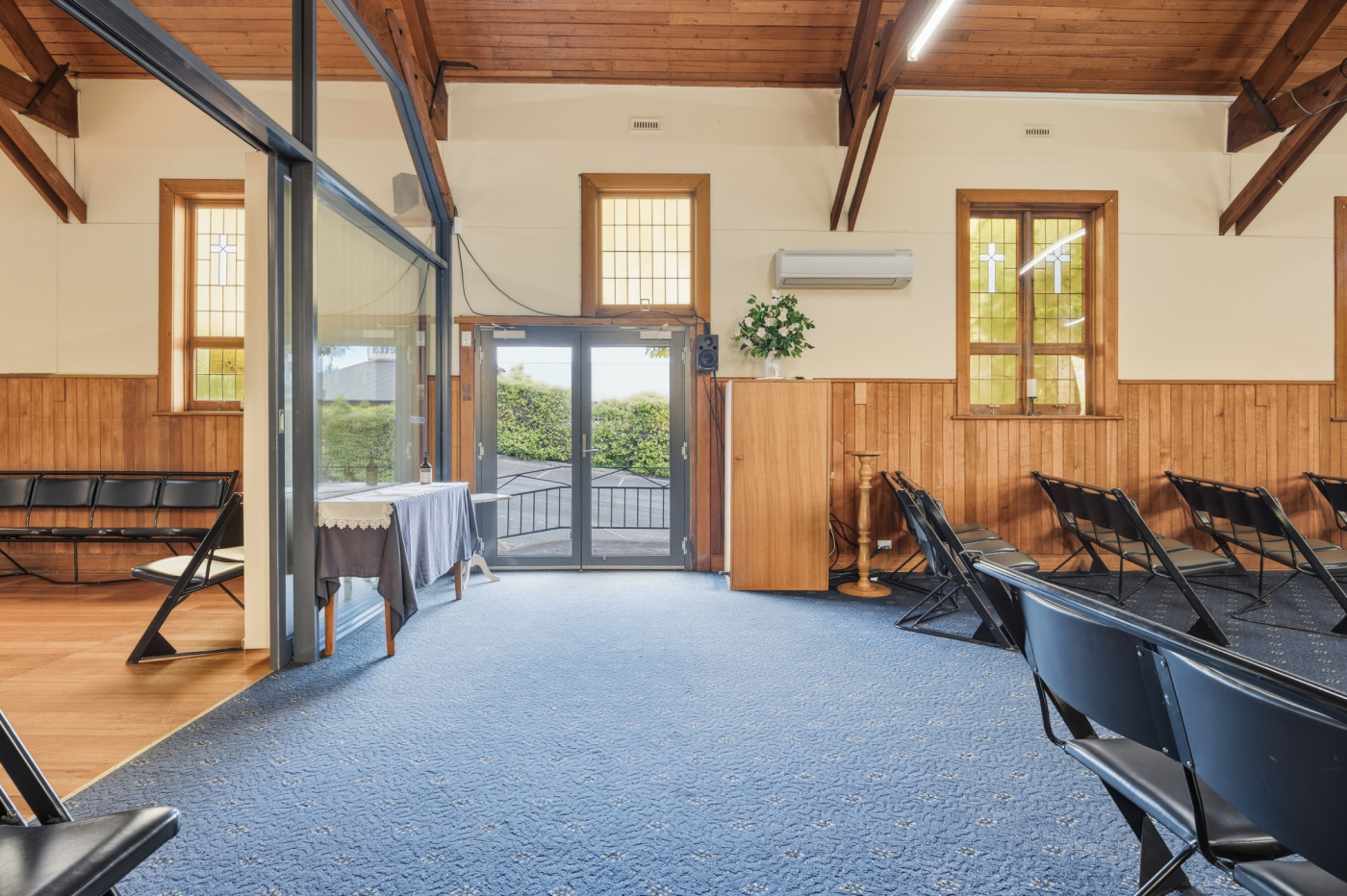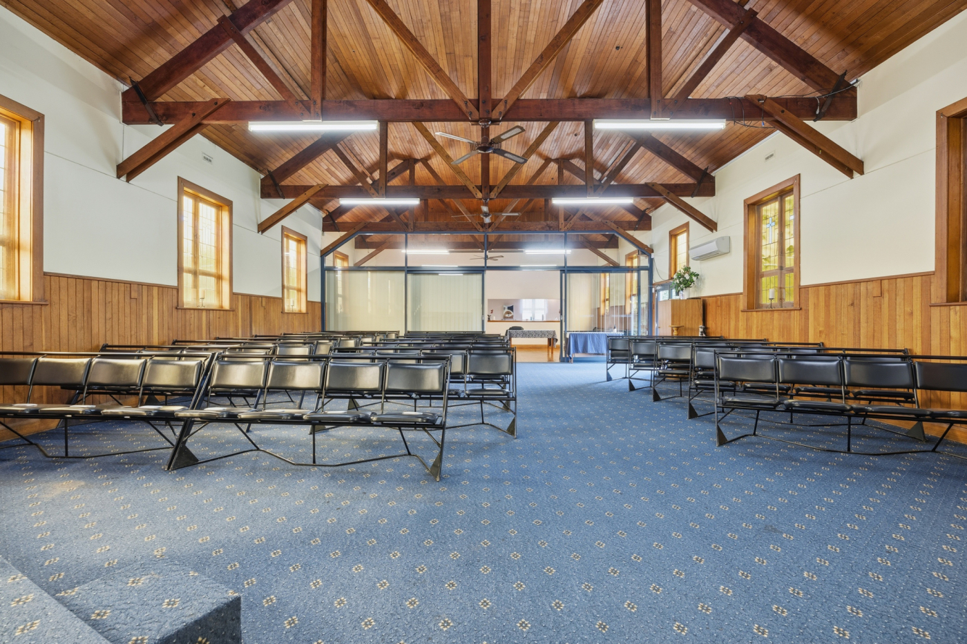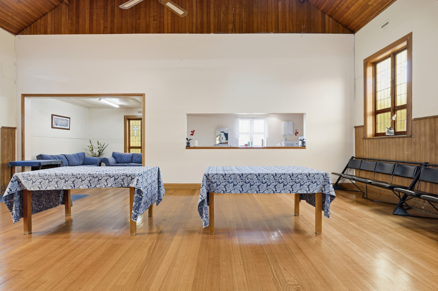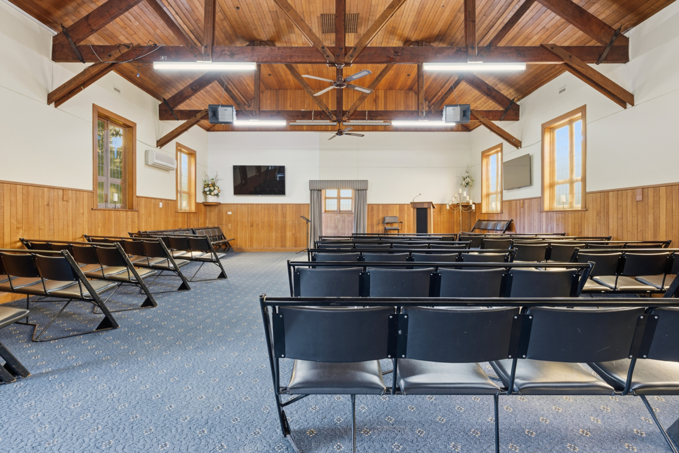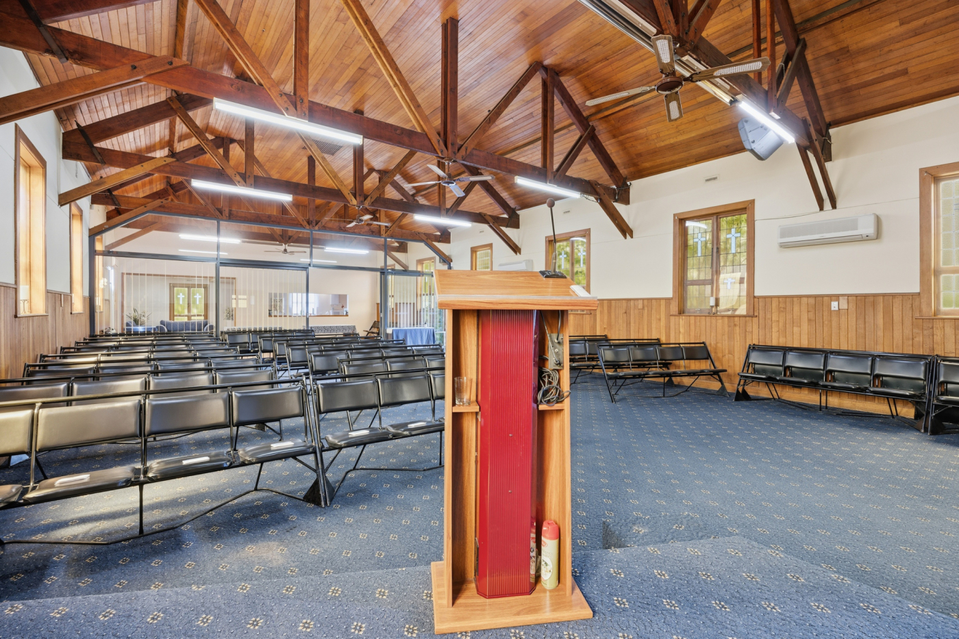 The existing 235m² building is positioned centrally on the northern lot and offers a functional layout complemented by multiple heat pumps, kitchenette facilities, toilet amenities, and a charming chapel-style interior featuring attractive timber ceilings with exposed beams.
