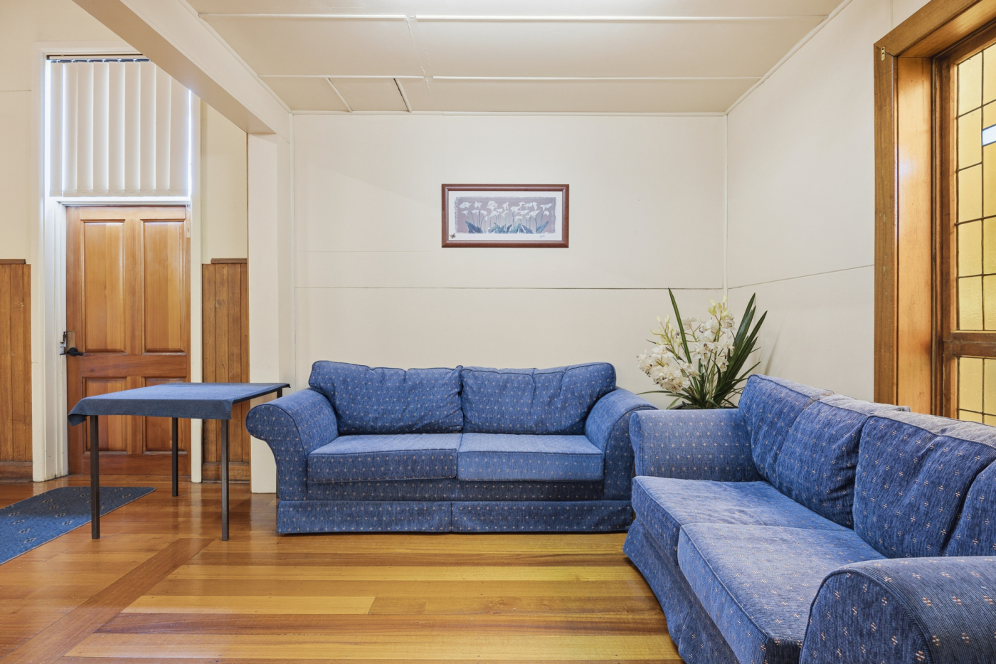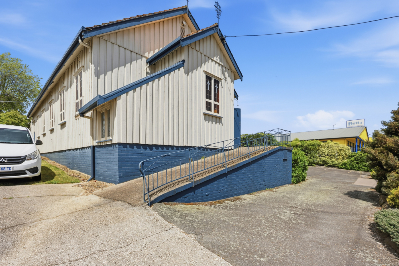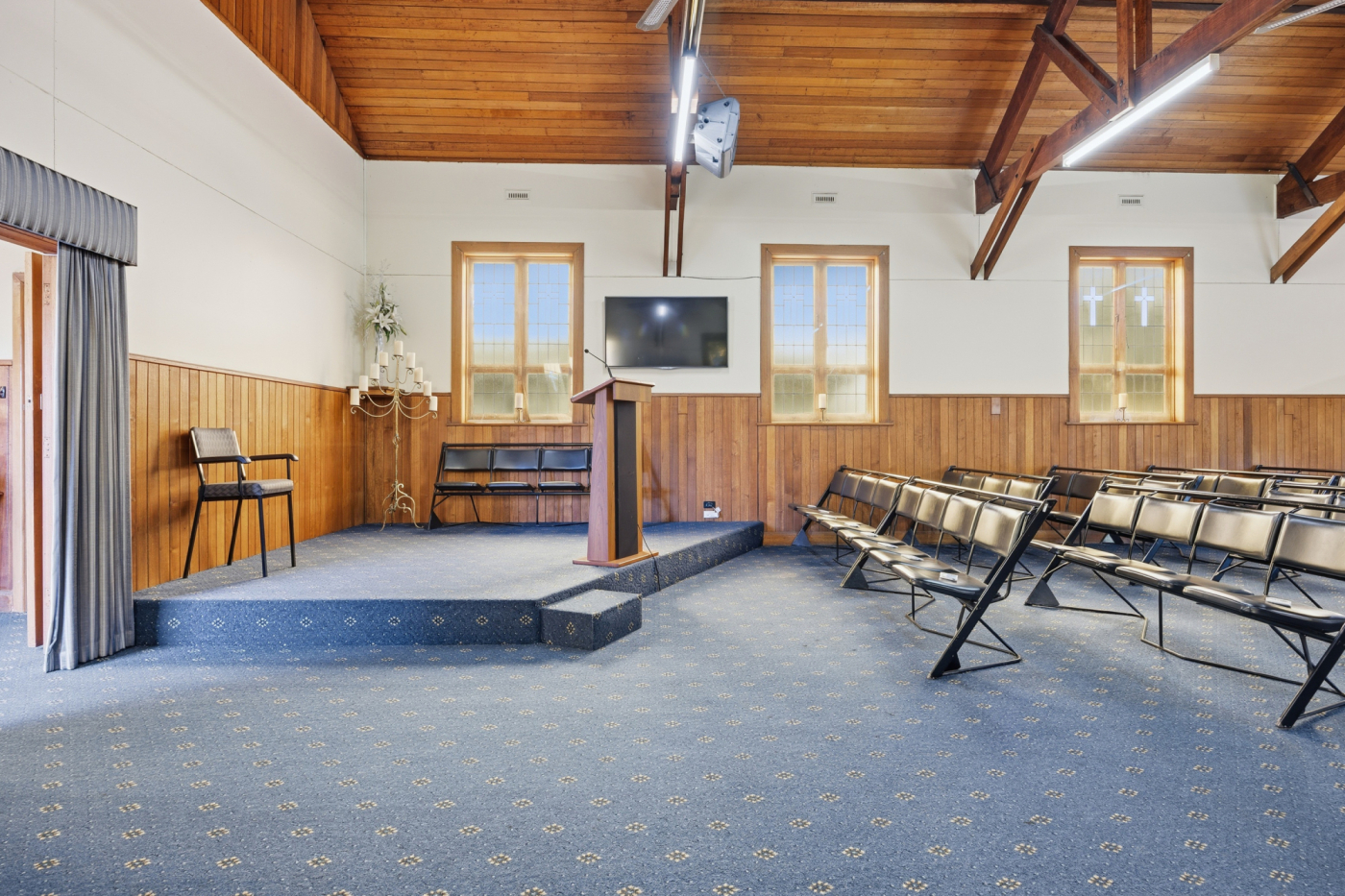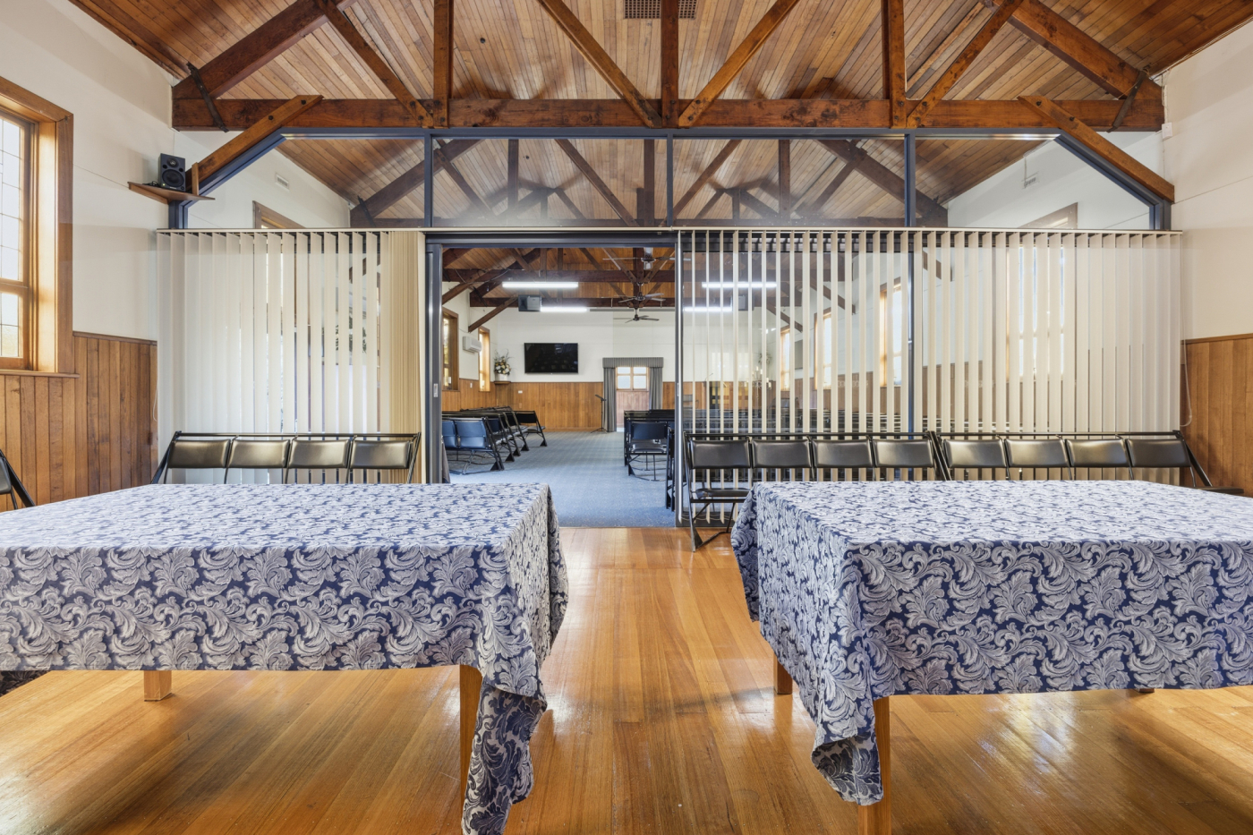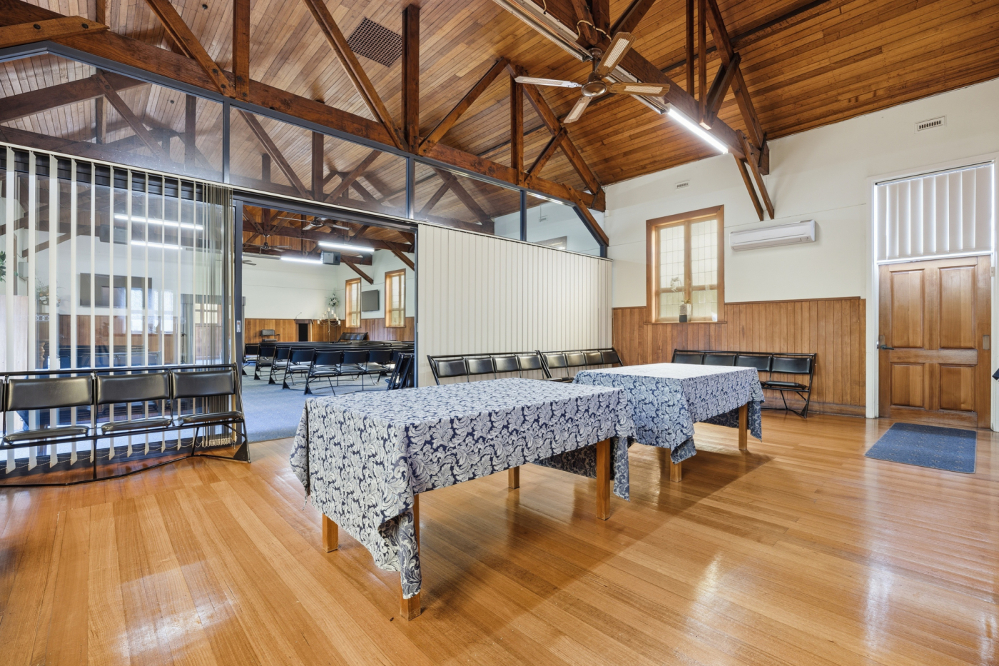 The existing 235m² building is positioned centrally on the northern lot and offers a functional layout complemented by multiple heat pumps, kitchenette facilities, toilet amenities, and a charming chapel-style interior featuring attractive timber ceilings with exposed beams.