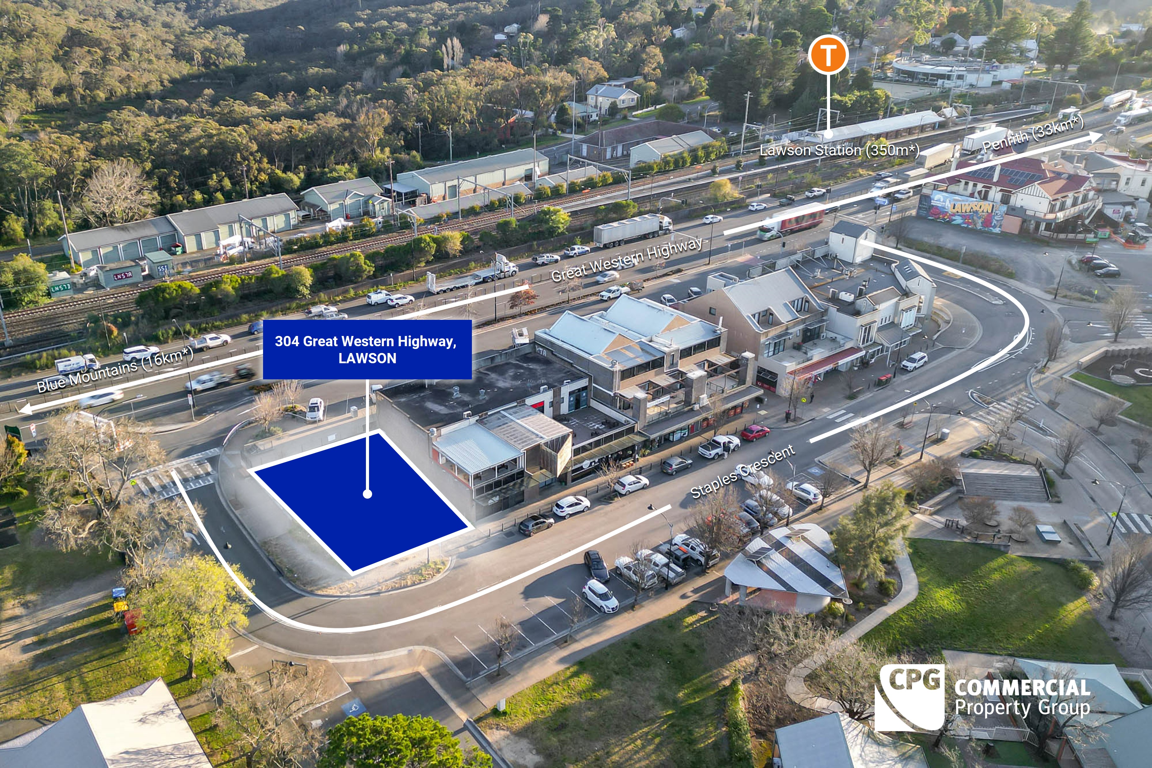 Situated in the iconic Blue Mountains region, a globally recognised tourist destination, this property is located within Lawson's retail precinct and is just 350m* walk to Lawson Station. It is strategically positioned 33km* from Penrith to the east and 14km* to Katoomba, with only a 50-minute drive* (51km*) to the new Western Sydney International Airport. The site offers quick access to the Great Western Highway, enhancing its connectivity.