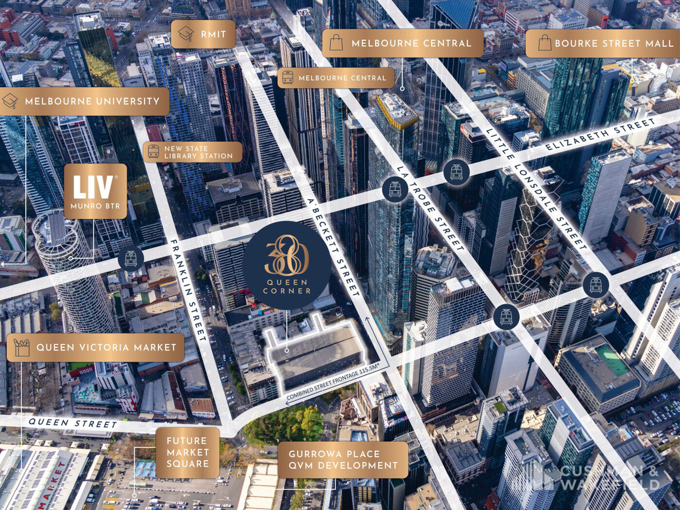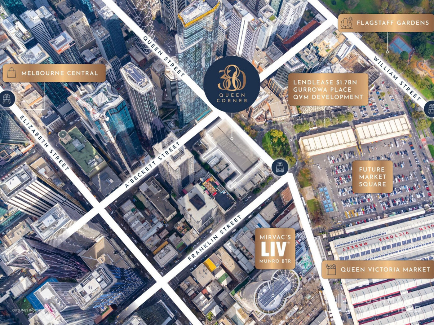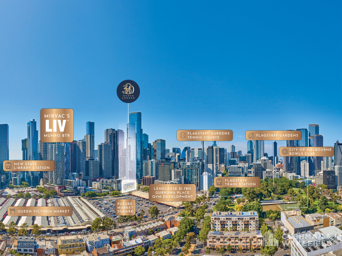 - Positioned moments from Melbourne’s dynamic precinct, poised to gain from the Queen Victoria Market renewal and Lendlease’s $1.7bn+ Queen Vic Project (Gurrowa Place).