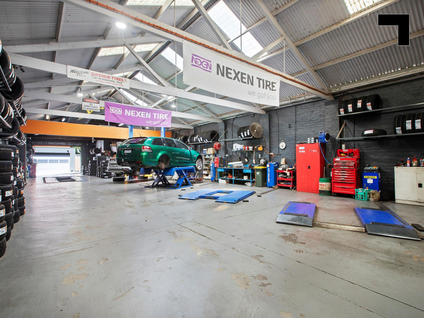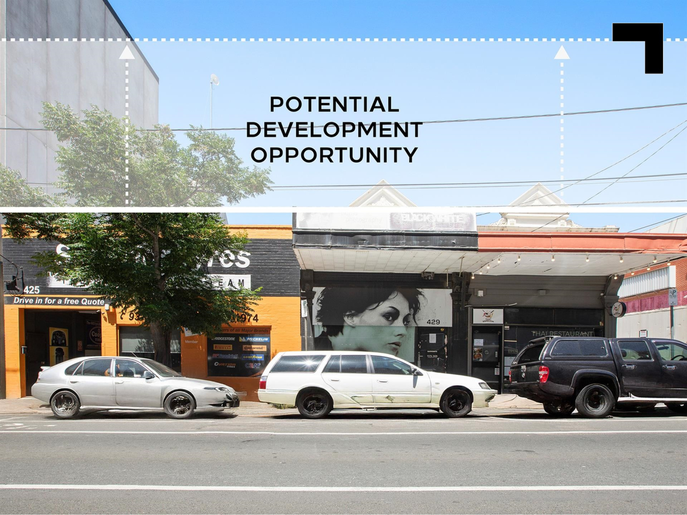 425-427 Macaulay Road, leased to Superior Tyres, featuring drive-in access and prominent street signage for high visibility. 429 Macaulay Road is a 371 sqm* retail/studio/warehouse space available with vacant possession, offering endless possibilities, whether for retail, hospitality, office, or showroom use, benefitting from nearby multilevel mixed use developments bringing hundreds of potential customers to your door.