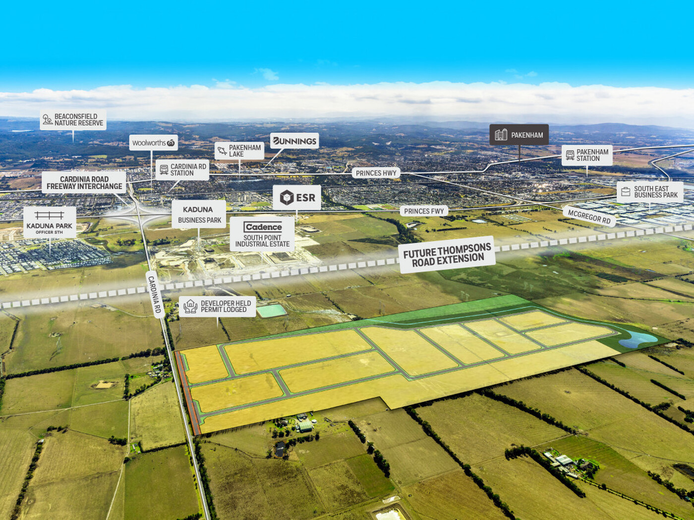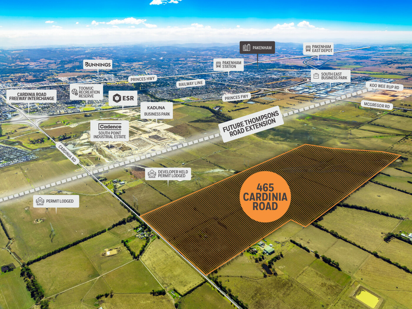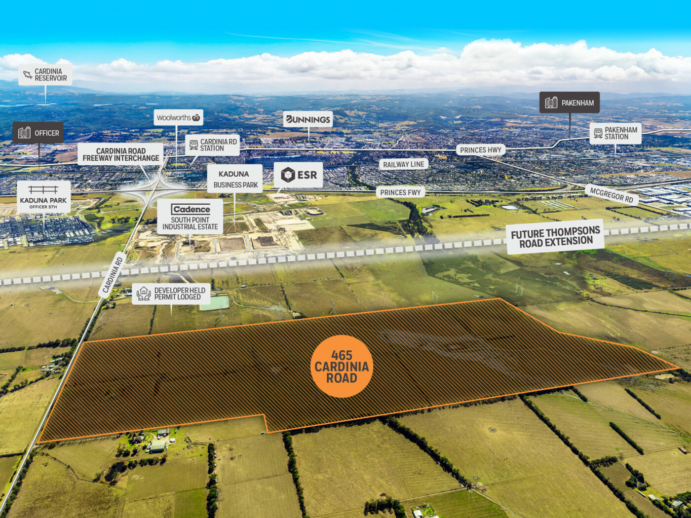 Situated in a state significant industrial precinct and comprising an expansive 99 hectares*, 465 Cardinia Road Officer South is locate in proximity to Cadence Property Group’s ‘South Point’ industrial estate, MC Mullin/ Facey’s Kaduna Business Park and ESR Australia’s Enterprise Industry Park.