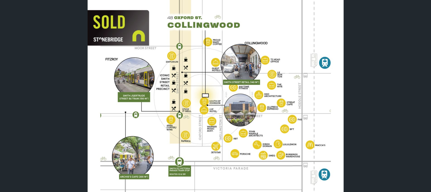 Situated in the dynamic hospitality and accommodation precinct of Collingwood, 48 Oxford Street boasts a premium position only 125 m* from iconic retail strip Smith Street.