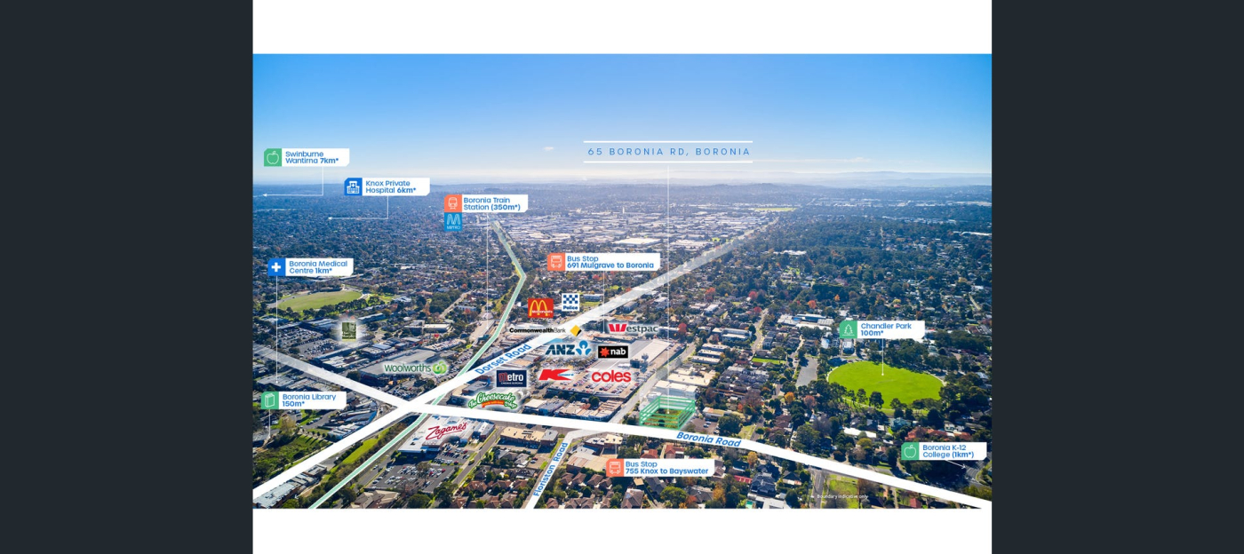 - Within the Boronia Activity Centre and surrounded by major local amenity including Boronia Train Station (350*), Boronia Mall (50m*) housing Coles, Woolworths and Kmart, Dan Murphy’s (500m*), the Boronia Library, major banks and medical services