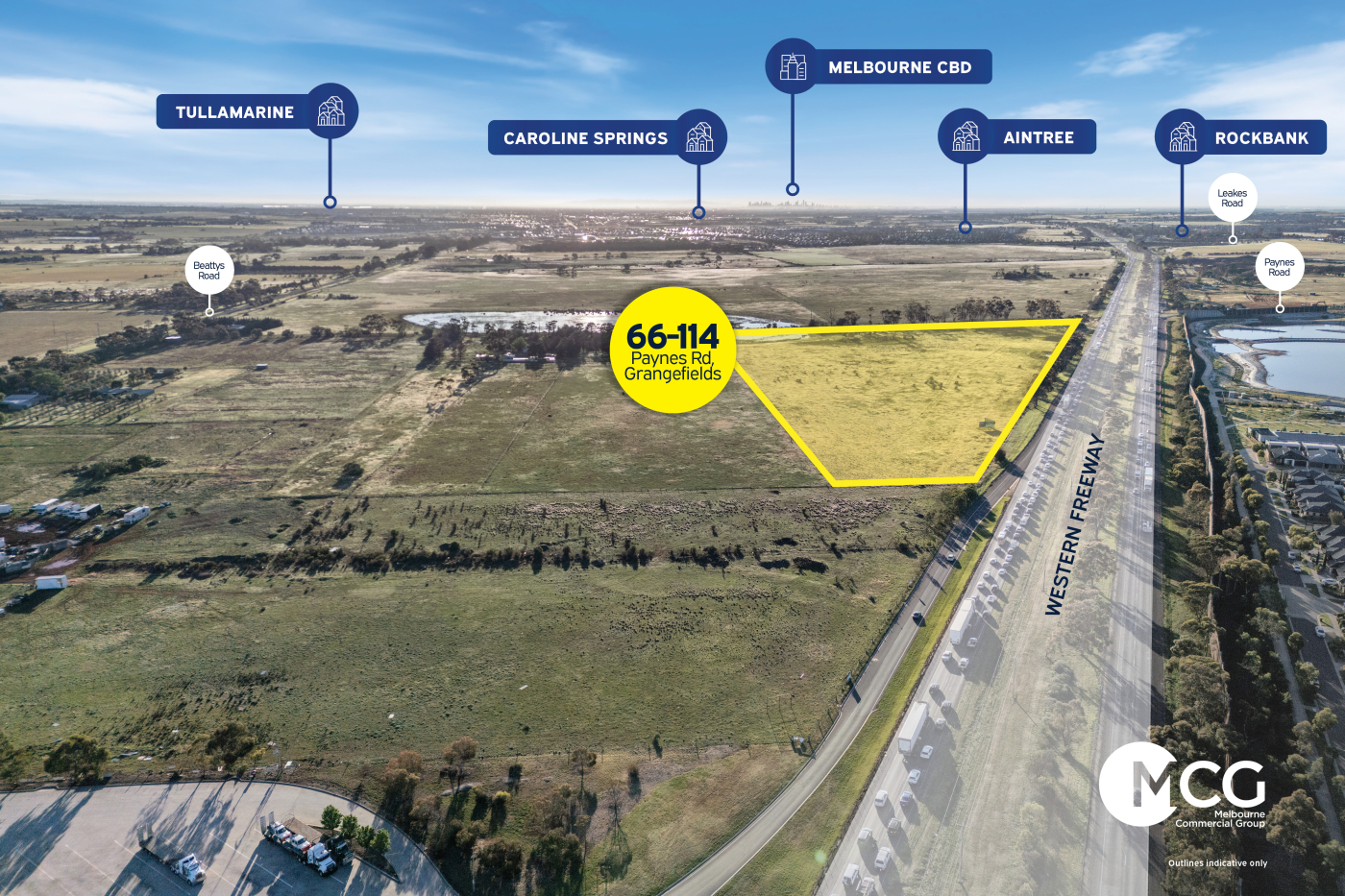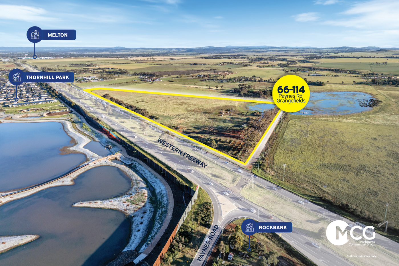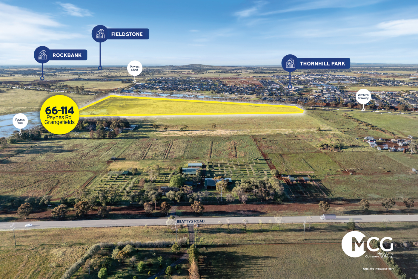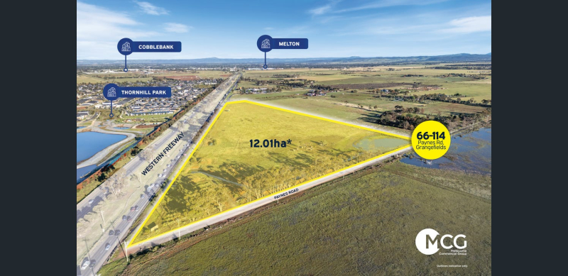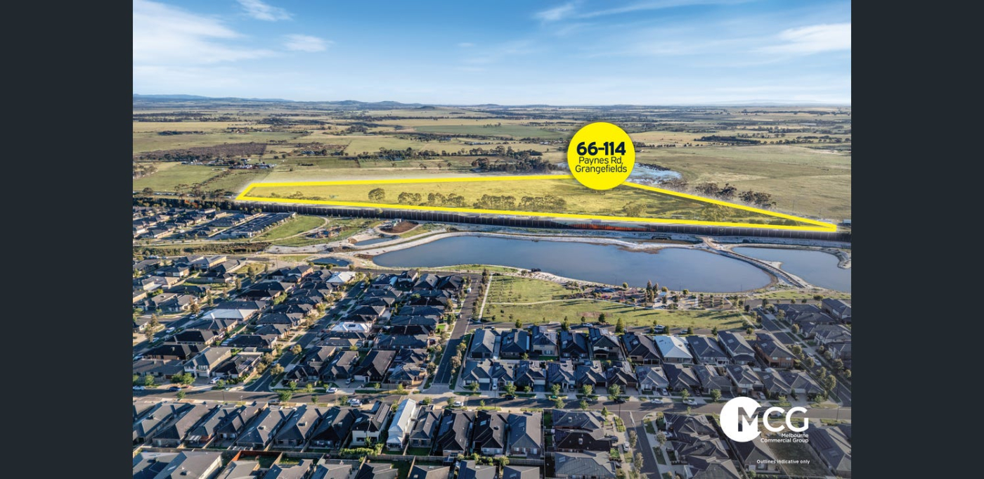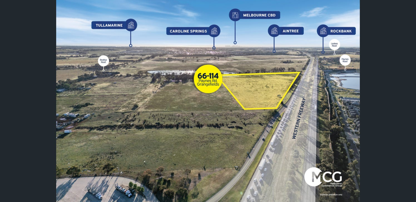 Melbourne Commercial Group is pleased to present 66–114 Paynes Road, Grangefields. Perfectly positioned between Melton and Caroline Springs, this exceptional landholding offers prominent Western Freeway exposure and immediate proximity to established masterplanned communities including Woodlea Estate and Thornhill Estate.
