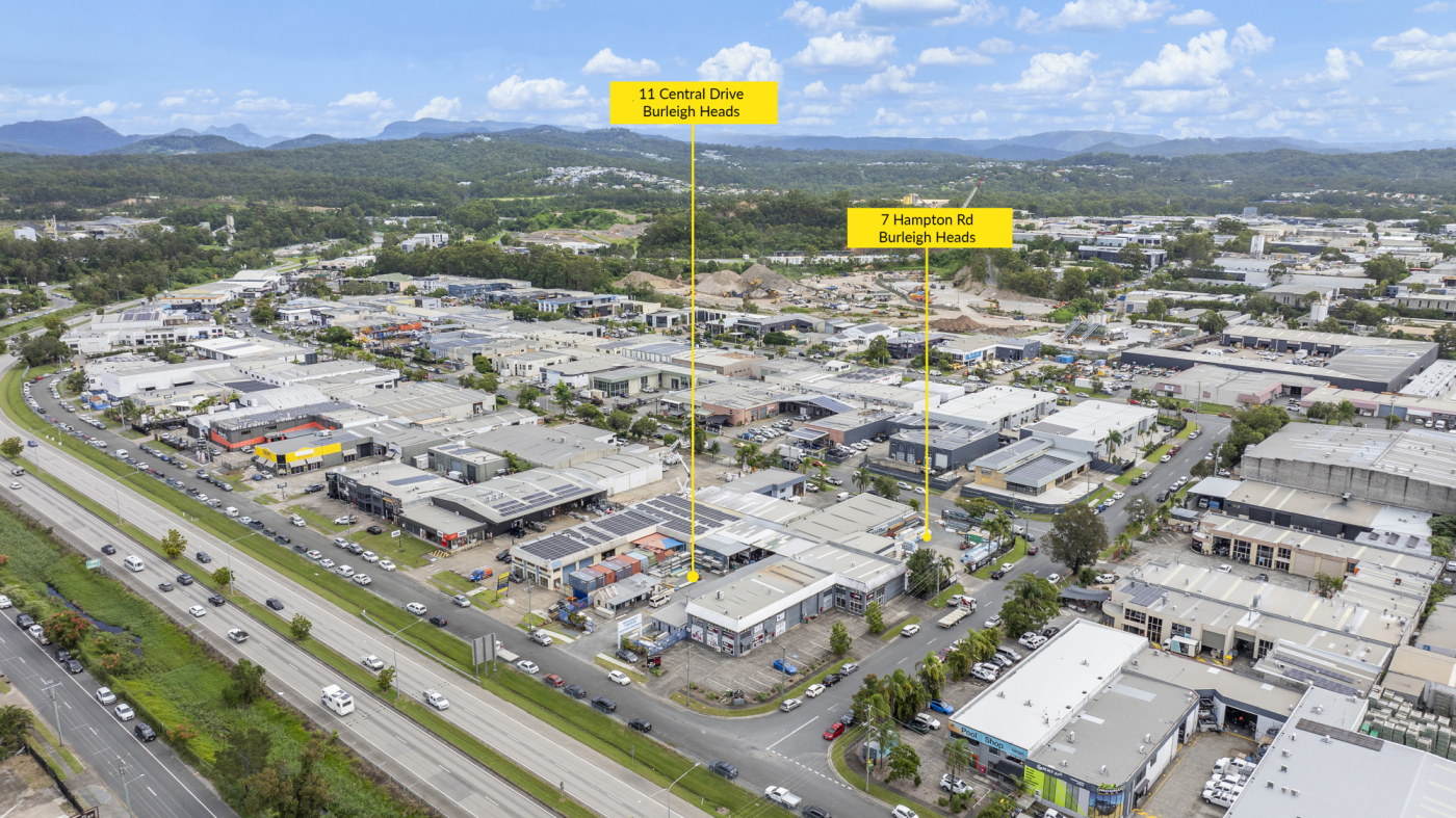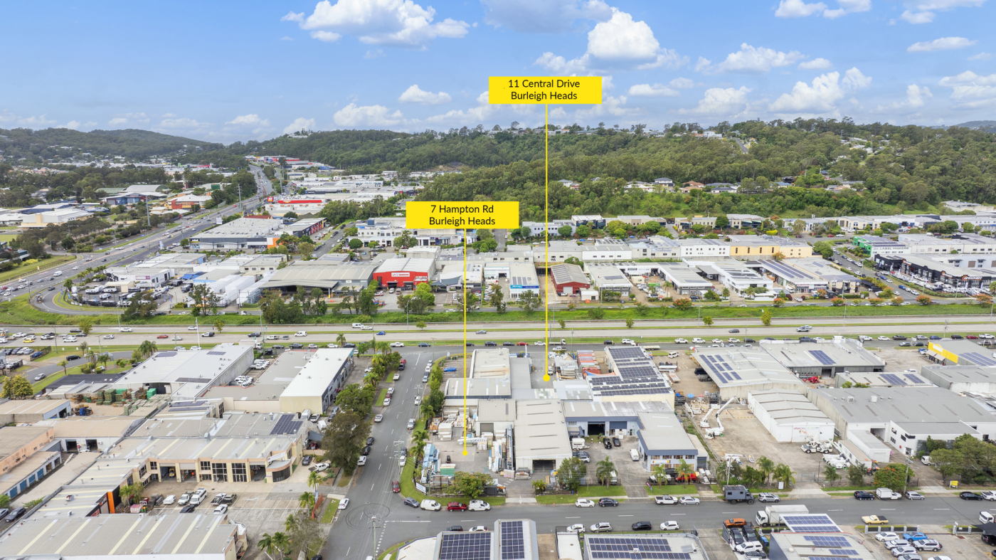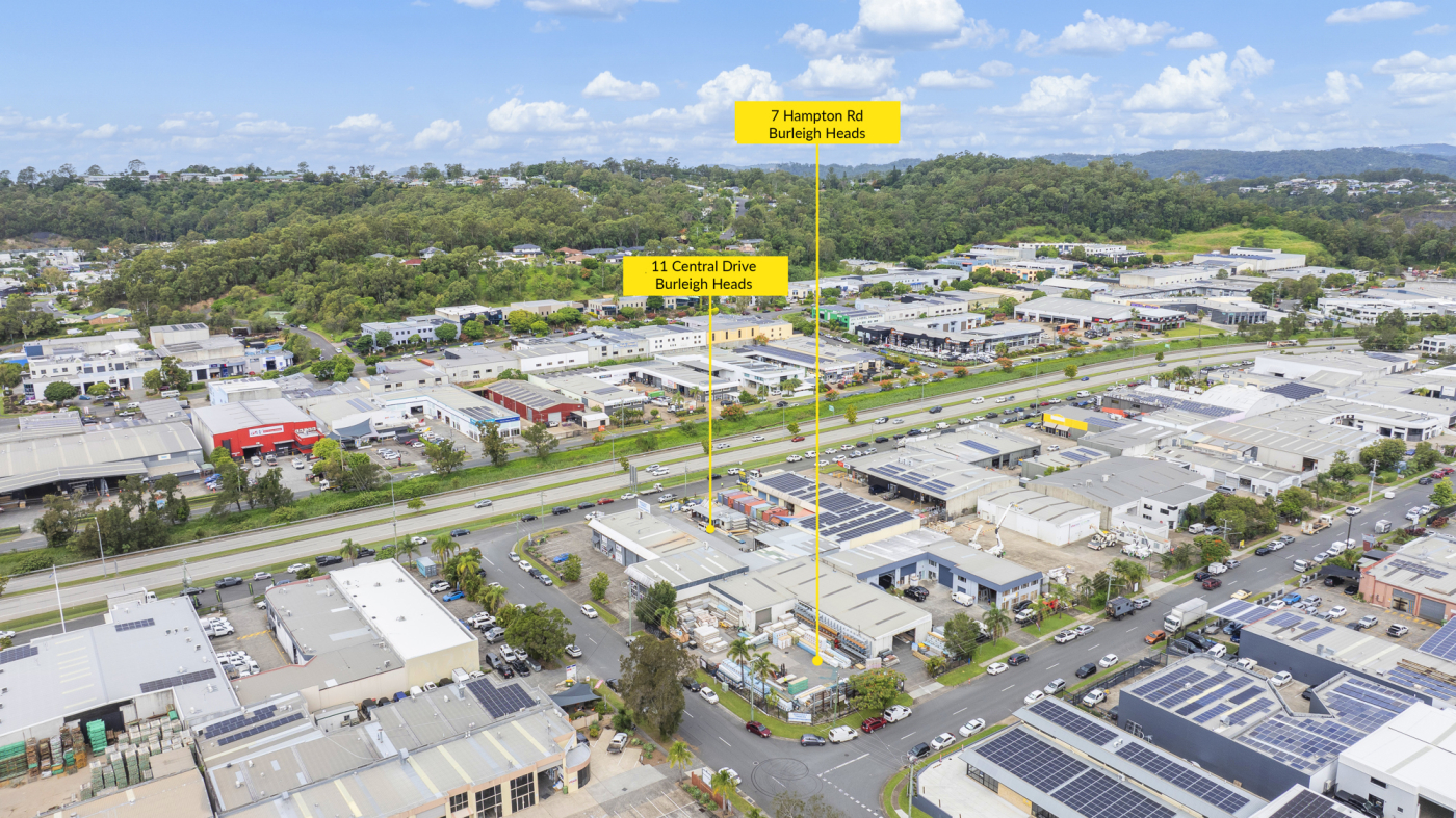 Peter Laoudikos and Charlie Pleotz are proud to present an exceptional opportunity to secure a highly sought-after industrial holding in the heart of Burleigh Heads. Comprising two adjoining lots at 11 Central Drive and 7 Hampton Road, this rare offering presents a combined land area of 3,377m* under two separate titles - available for purchase together or individually.