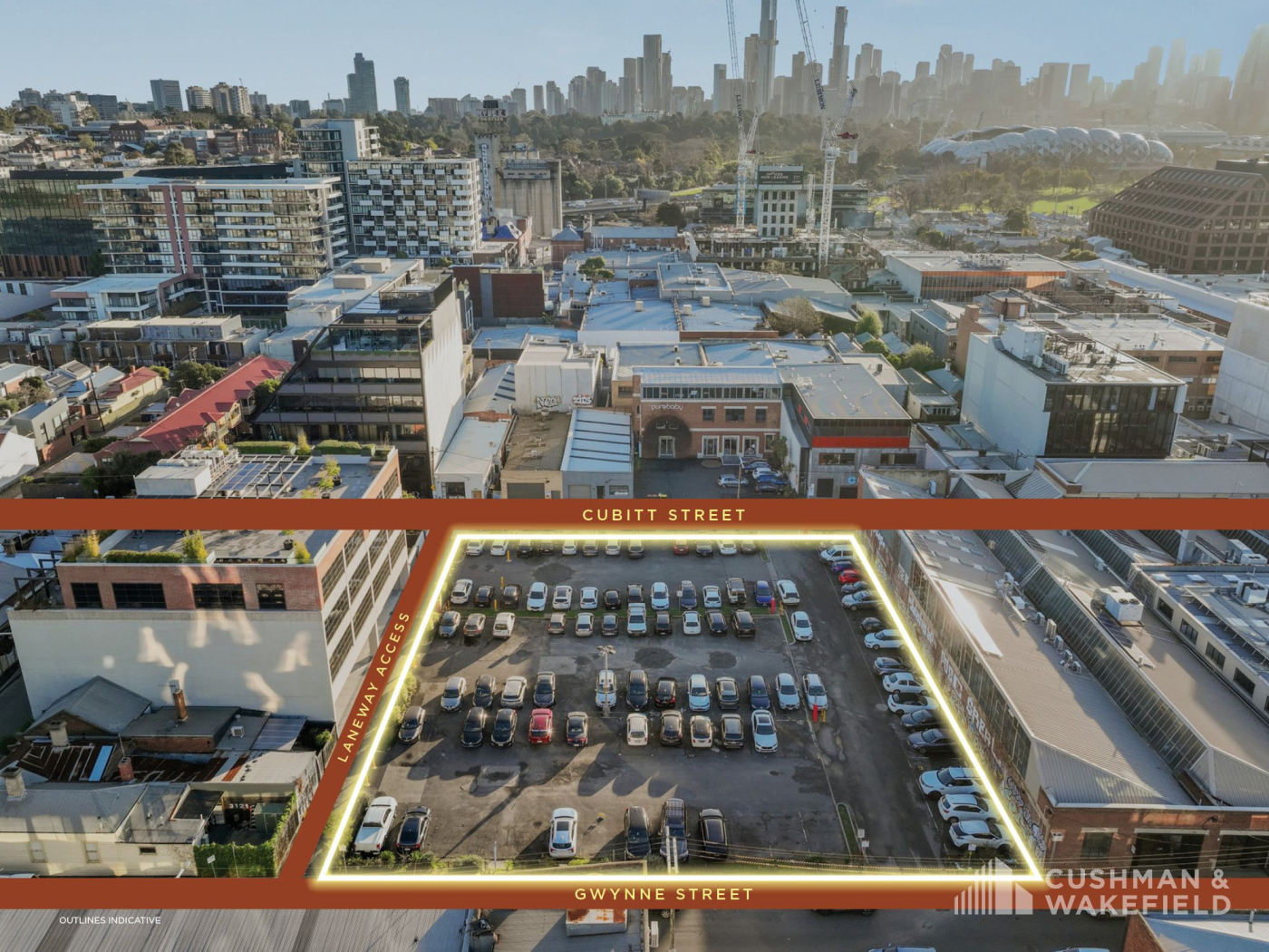 - One of Cremorne’s largest amalgamated parcels of land offering 2,636sqm of prime commercial land as well as some 100m (approx.) of frontage to both Cubitt & Gwynne Street.