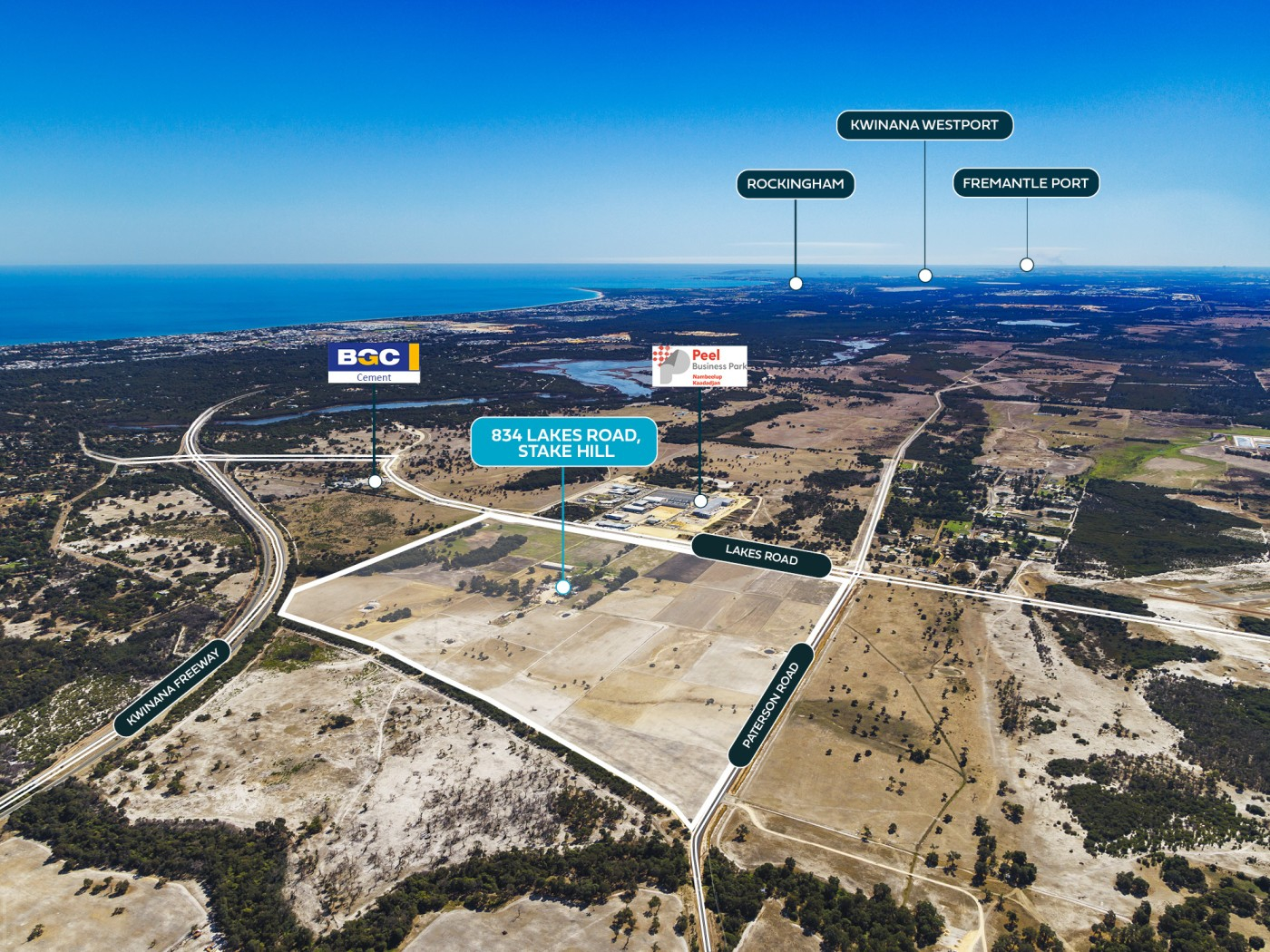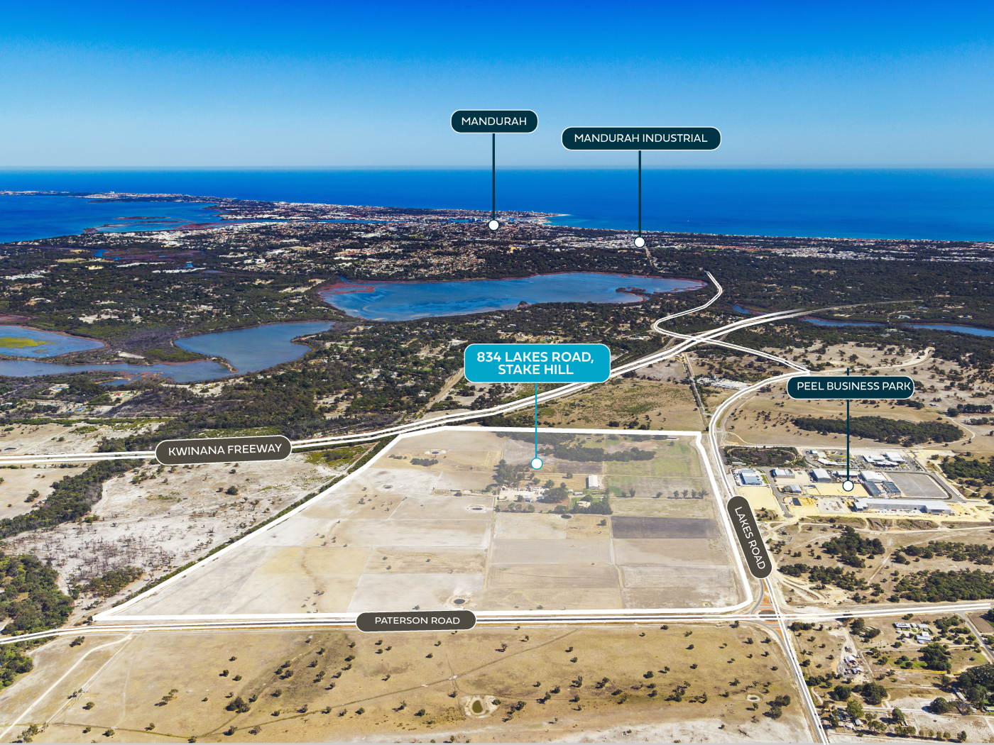 Located just 1.5km from the Lakes Road / Kwinana Freeway interchange, the property offers excellent connectivity to Mandurah, the Perth metropolitan area, and the broader South-West corridor. With dual frontage to Lakes Road (1,074m*) and Paterson Road (1,151m*), and exposure to the Kwinana Freeway, the site presents a high-profile opportunity for development.