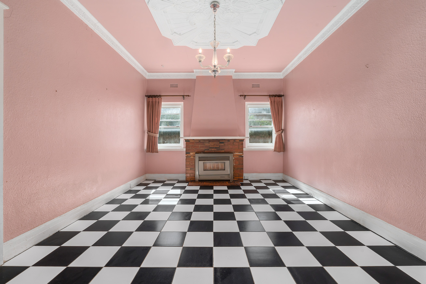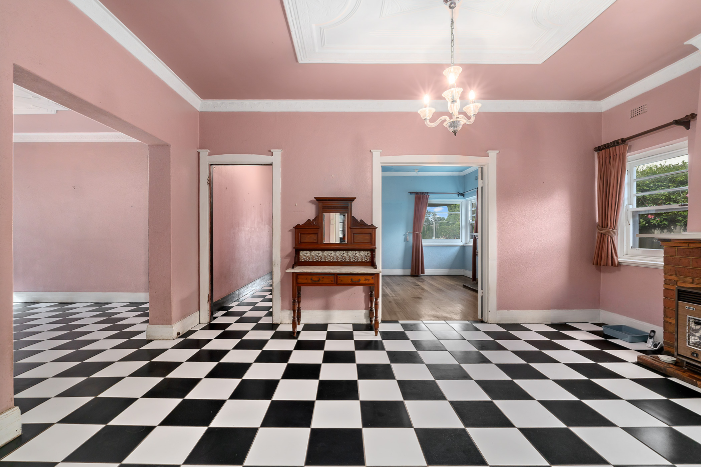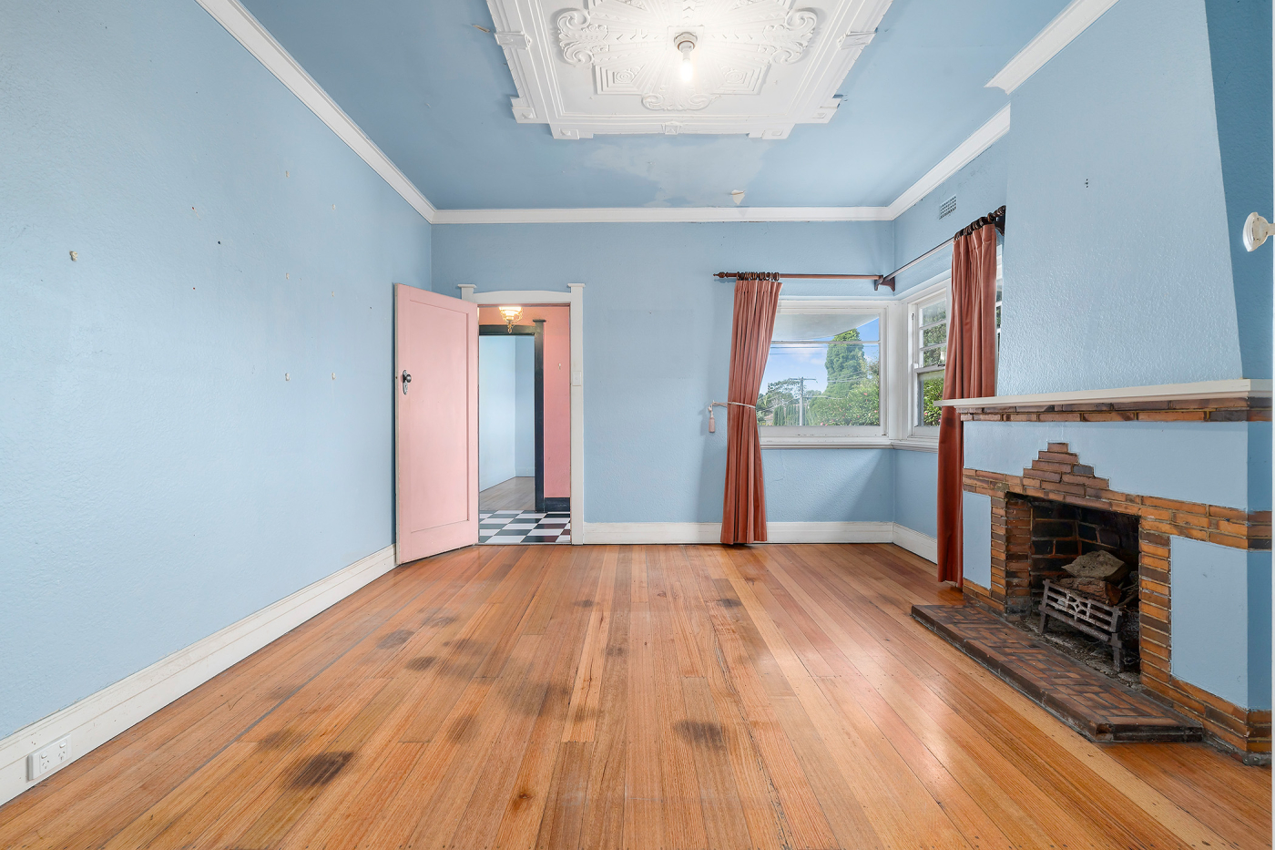 The home provides a flexible layout. At the front, three bedrooms (one with an open fireplace), sit alongside a family room with a fireplace, whose double doors open through to an expansive dining room and a large living room. Decorative ceilings, and a pastel and vivid colour palette feature through several of the rooms.