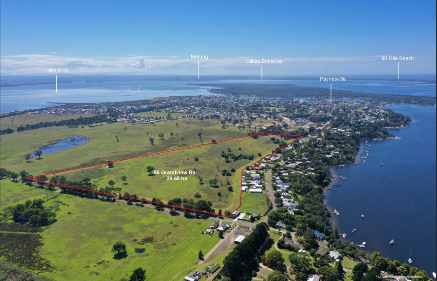 This important property located at 95 Grandview Road, Paynesville, holds a vital importance to the long term future and development of Paynesville. Situated on the western boundary of the coastal township of Paynesville on the popular and iconic Gippsland Lakes. The property is on two titles, one being approximately 3.701ha and the other, approximately 20.98ha. Having a total road frontage to Grandview Road of 513.28 metres (approximately) there are also three further access points which have access to Newlands Drive (a main thoroughfare). 95 Grandview Road, Paynesville, truly is a rare and exciting development opportunity (S.T.C.A.)