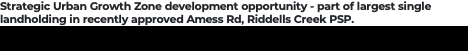Strategic Urban Growth Zone development opportunity - part of largest single landholding in recently approved Amess Rd, Riddells Creek PSP• Land Area: 13.34 hectares (approx.)