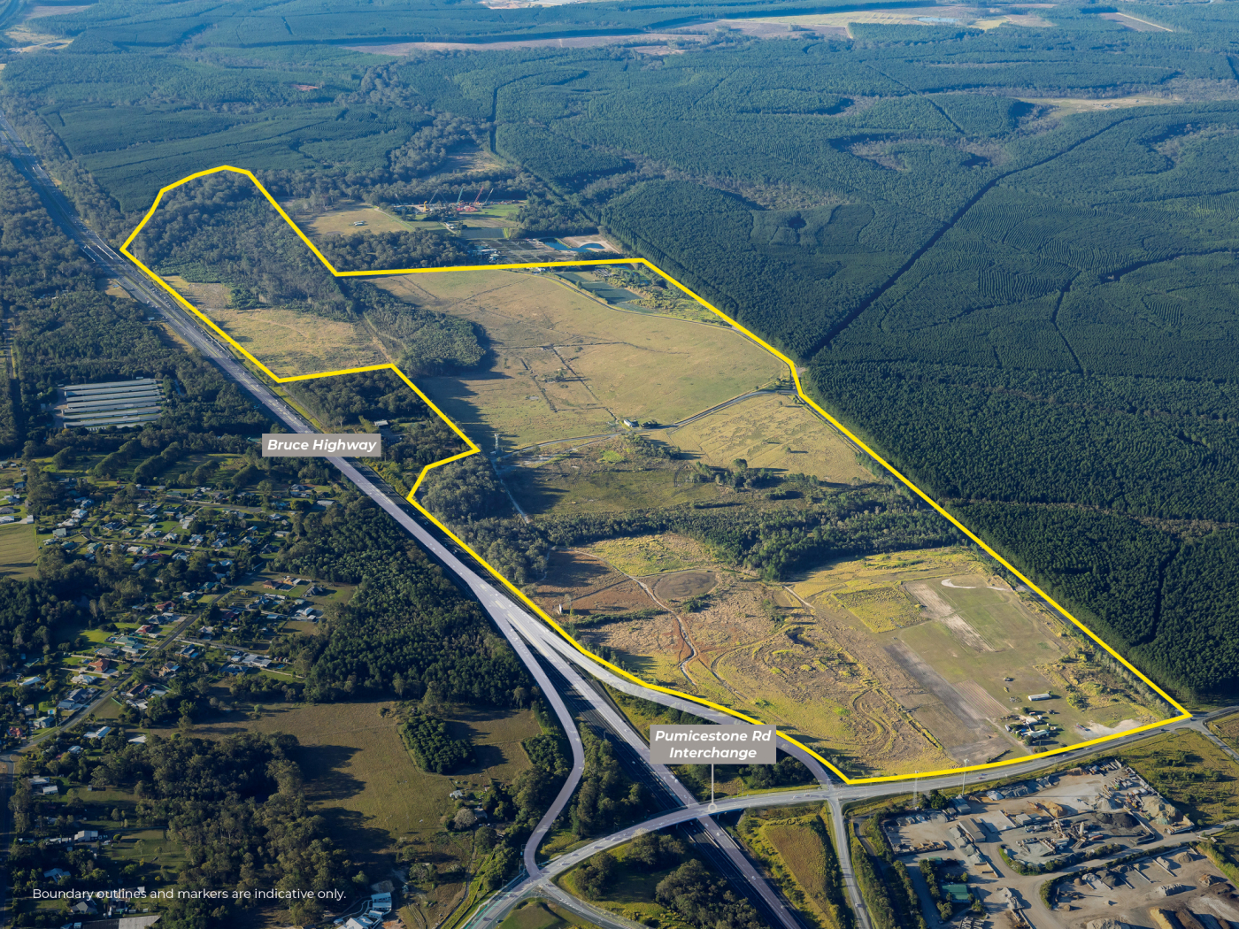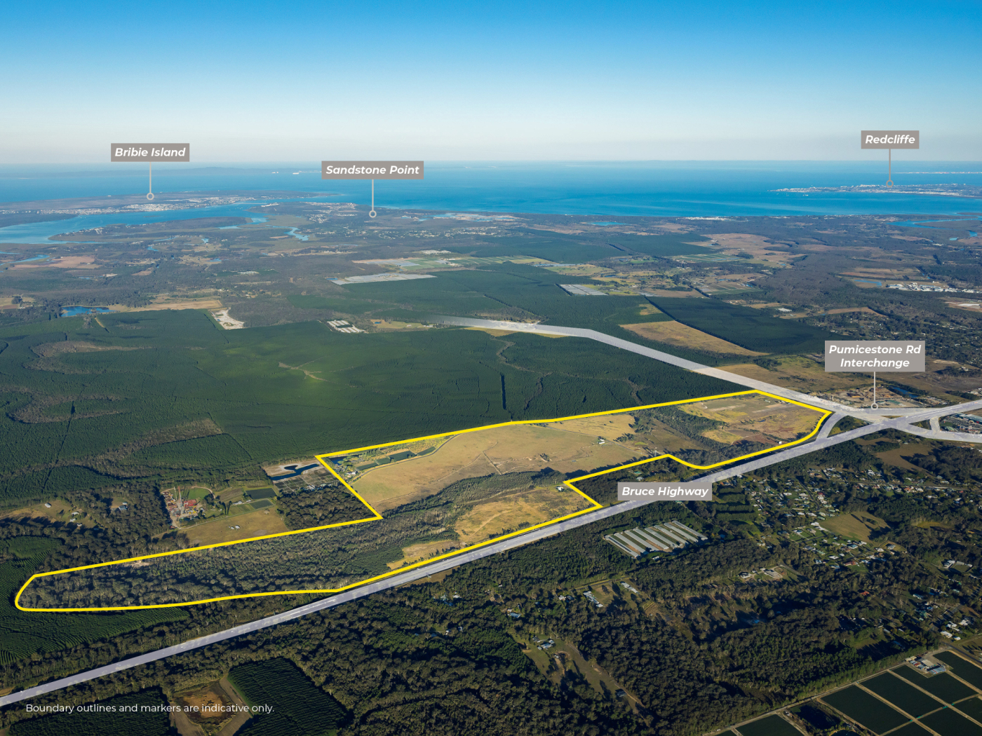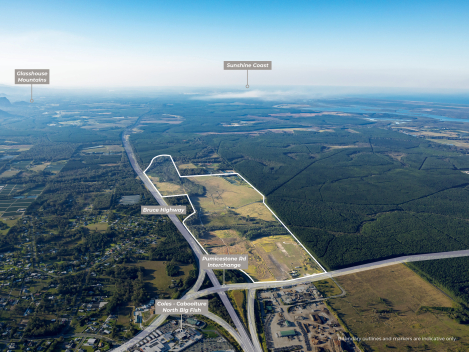 • Situated 250m* from the Bruce Highway / M1 Interchange the property offers a generally level & predominantly cleared site with over 1.6km* of road frontage to Pumicestone Road & Clinker Road.